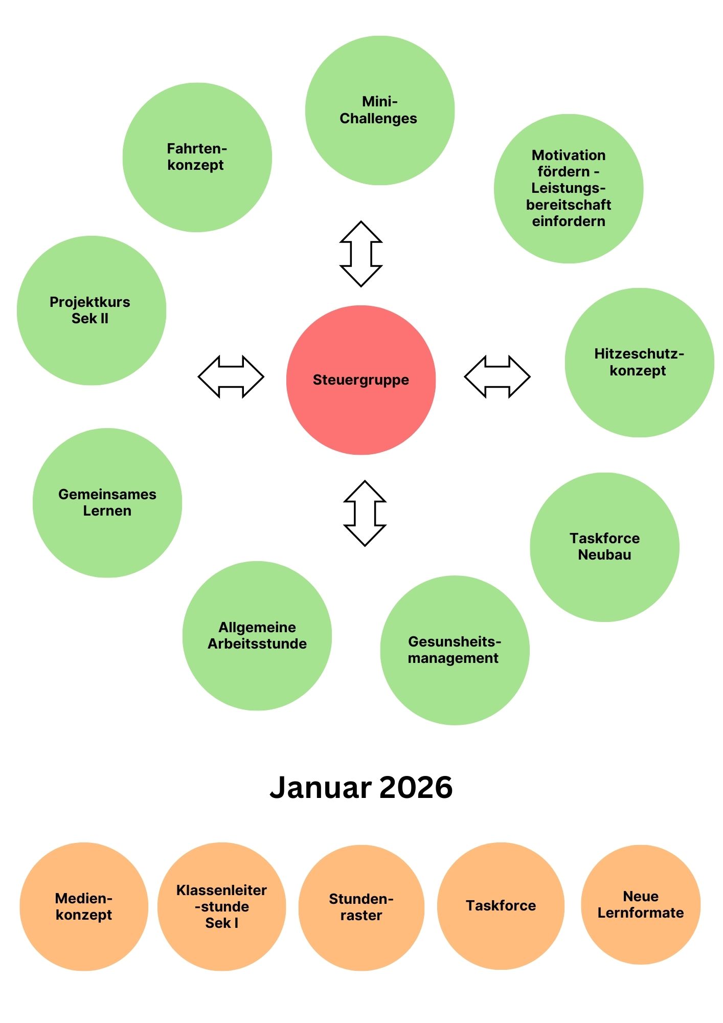 Basierend auf der von der Schulgemeinschaft entwickelten Schulvision schlug die Steuergruppe zu Beginn die Einrichtung von neun Arbeitskreisen vor, um die Ziele der Vision zu erreichen.